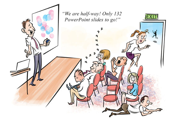 This is another cartoon created for Rob Redenbach for a powerpoint presentation, illustrating a very real concern to those presenting one. Again the over exaggeration of a cartoon can present your idea clearly, adding a little amusement along the way to highlight the statement you wish to make. This too helps the audience retain these relevant points gaining a clearer overall view of your presentation.